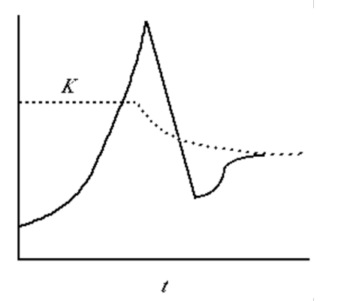 B. Modèle d'évolution d'une population qui dépasse la valeur K, capacité de charge du milieu figurée en pointillés (cours d'écologie des populations de l'Université du Wyoming). Si ce schéma général est appliqué à la population de l'espèce dominante sur Sol3, on peut situer le temps présent juste avant la pointe du pic, alors que K a commencé à décroitre.