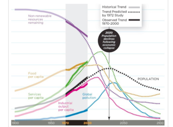 Fig. 4. Réexamen du modèle World3 publié initialement par Meadows et alen 1972. Ce modèle permettait d'intégrer les relations entre population et ressources, nourriture, services, production industrielle et pollution de 1900 à 1970. Ses prédictions jusqu'en 2100 sont en pointillés. La comparaison entre prédiction et réalité a été figurée sur ce graphique par Linda Eckstein- pour la revue en ligne du Smithsonian Institute - à partir des données publiées par G. Turner pour la période 1970-2000 (en traits pleins). Cette mise à l'épreuve du modèle conforte la prévision d'un effondrement prochain du système économique sans même que la crise écosystémique globale soit prise en compte.