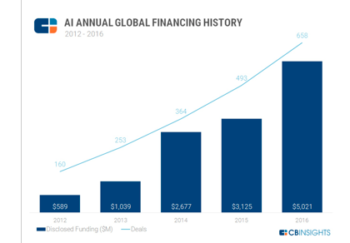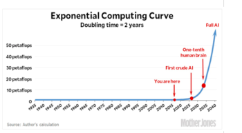 Fig. 5. A. Le financement de l'intelligence artificielle de 2012 à 2016. Une autre source (Statista) prévoit une augmentation rapide des bénéficesgénérés par cette industrie qui devraient atteindre plus de 30 milliards de dollars en 2025. B. La croissance des capacités de traitement de l'information offerte aux algorithmes qui devrait amener rapidement à la singularité