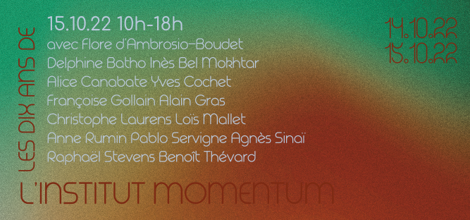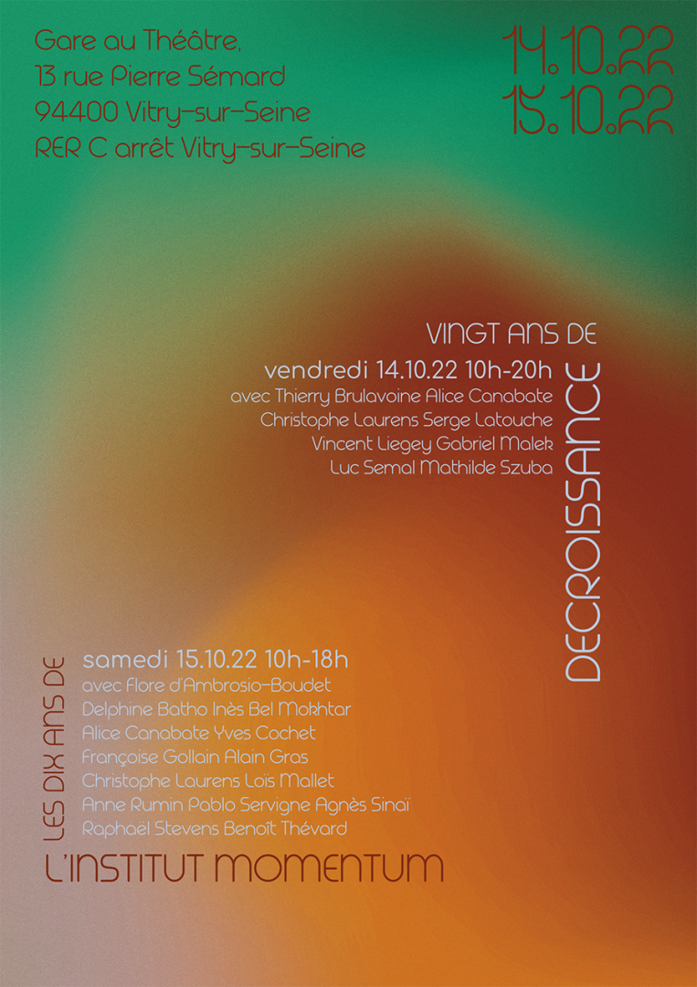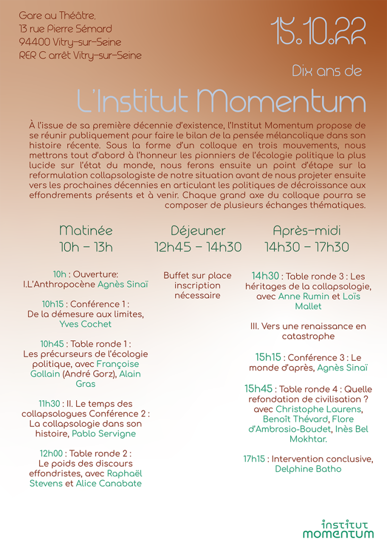 A l’issue de sa première décennie d’existence, l’Institut Momentum propose de se réunir publiquement pour faire le bilan de la pensée mélancolique dans son histoire récente. Sous la forme d’une rencontre en trois mouvements organisée dans un lieu poétique, sur une friche ferroviaire jouxtant Paris, nous mettrons à l’honneur les pionniers de l’écologie politique la plus lucide sur l’état du monde, nous ferons ensuite un point d’étape sur la reformulation collapsologiste de notre situation avant de nous projeter vers les prochaines décennies en articulant les politiques de décroissance aux effondrements présents et à venir. Cette rencontre exceptionnelle réunira les cofondateurs de l'Institut Momentum et proposera des retrouvailles conviviales avec celles et ceux qui cheminent sur le chemin de crête des limites aux catastrophes. avec Flore d’Ambrosio-Boudet, Delphine Batho, Inès Bel Mokhtar, Alice Canabate, Yves Cochet, Françoise Gollain, Alain Gras, Christophe Laurens, Loïs Mallet, Anne Rumin, Pablo Servigne, Agnès Sinaï, Raphaël Stevens et Benoît Thévard.
