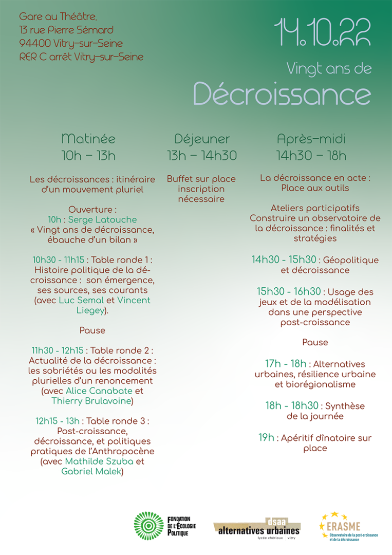 Cette journée sera précédée, la veille, d'une rencontre associée sur les décroissances, itinéraire d'un mouvement pluriel, qui fera le bilan de vingt ans de décroissance, avec une ouverture par Serge Latouche et la participation de Vincent Liegey, Luc Semal, Mathilde Szuba, parmi d'autres invitées, et se prolongera par des ateliers participatifs sur les outils politiques d'une société de décroissance, sous l'égide de l'Observatoire de la post-croissance et de la décroissance et de la Fondation de l'écologie politique.